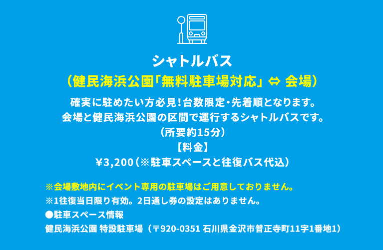 上記シャトルバス券及び駐車場券をご購入のお客様へはチケットの払い戻しをさせていただきます。